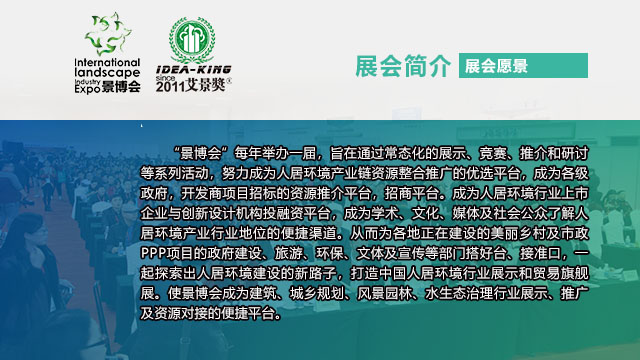 景博会有别于目前行业内的任何类似展会,这是一个以甲方、房地产商、设计师及设计机构为主体的行业盛会,将会在很大程度上帮助设计师了解资材最新动态,材料供应商集中接触设计师及设计机构的机会。景博会的目标将致力于整合一个由房地产商、设计师及设计机构及材料供应商为一体的超大型产业学术交流及贸易航母,面向国际国内行业的园林景观作品展示、新技术新材料发布、园林景观材料交易的新坐标。