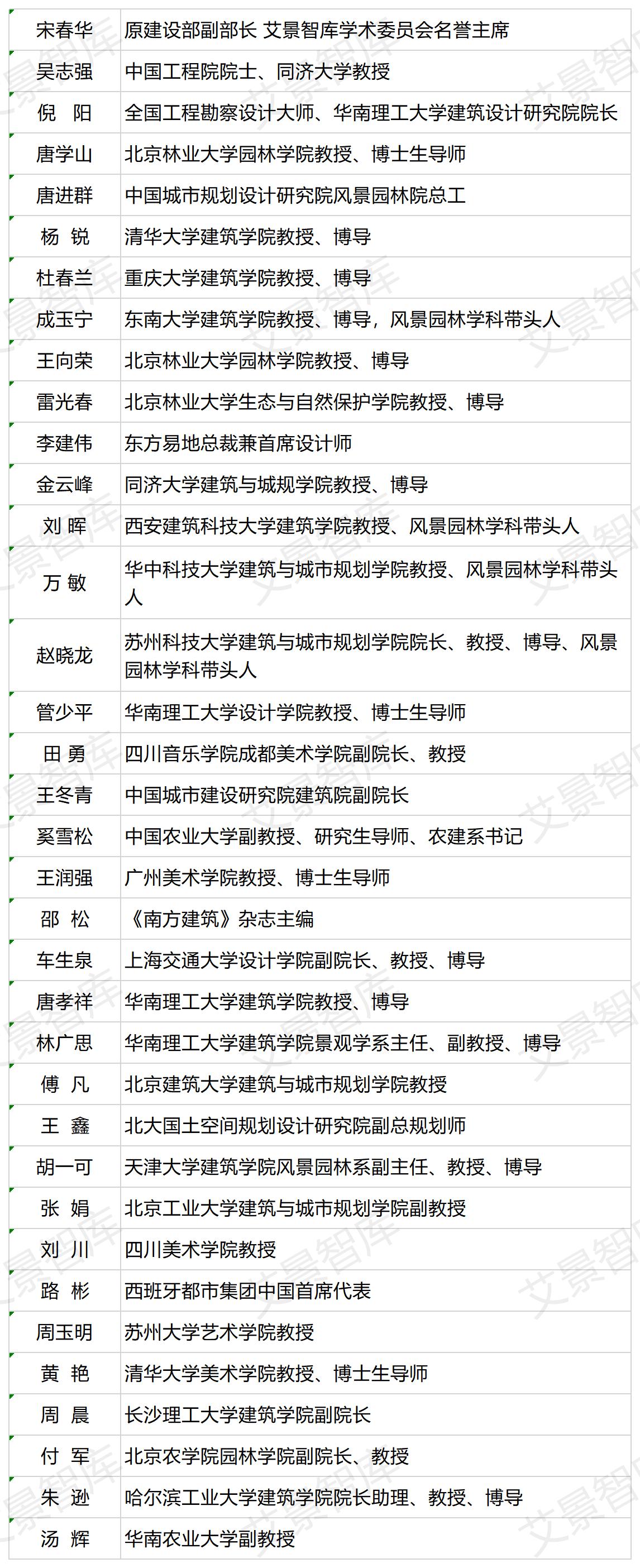 2022中国国际园林景观规划设计大赛评审采用匿名评审方式进行,每届大赛作品结束,组委会随机从世界人居智库和艾景智库成员中随机抽取15-21名评委参与评审,上一届评审名单如下: